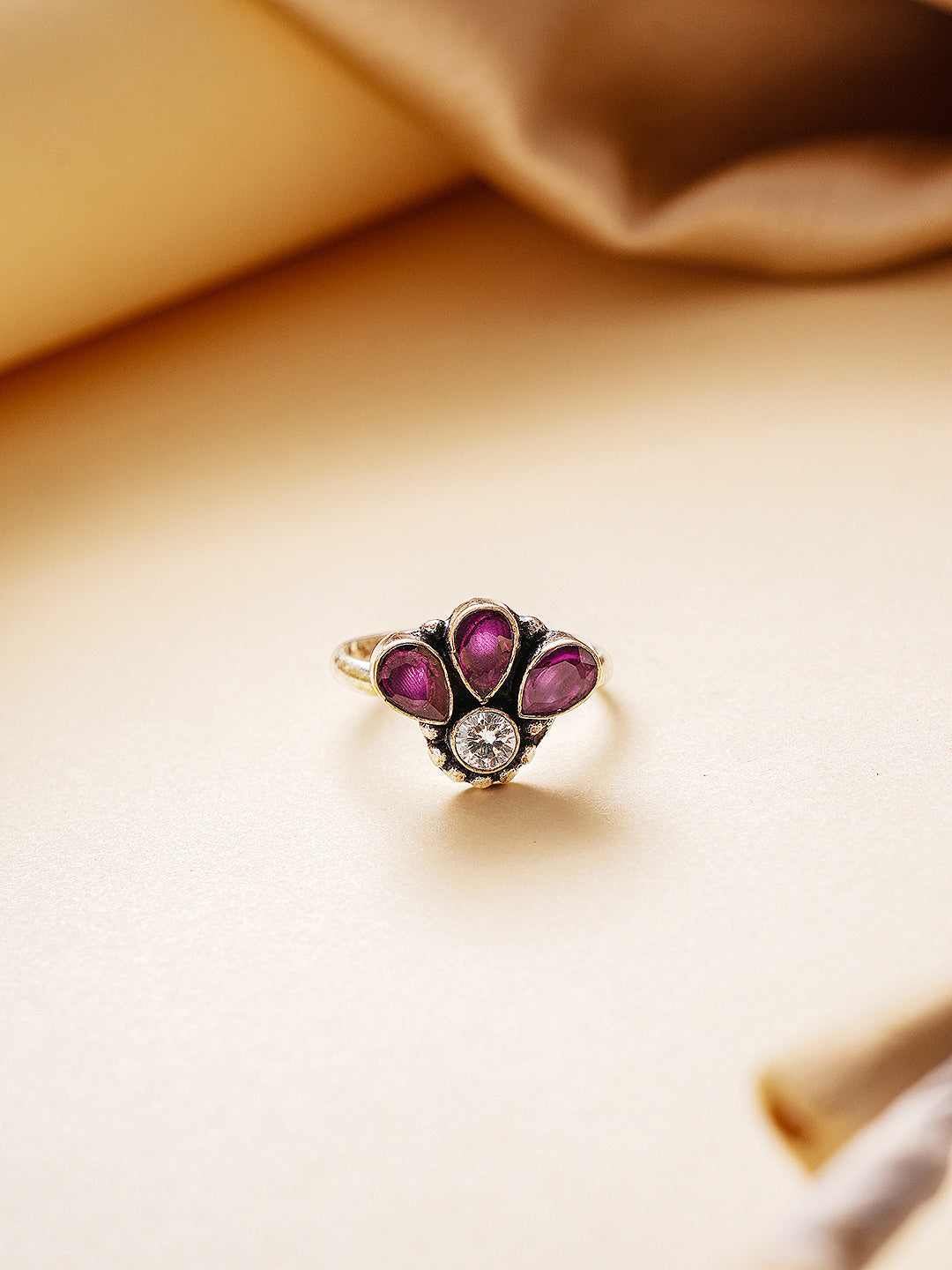 Designed with a delicate floral motif, this toe ring is adorned with a soft pink stone that adds a graceful pop of colour. The oxidised silver finish lends a vintage charm, while the handcrafted detailing enhances its classic appeal. Featuring an adjustable open fit, it ensures comfortable wear throughout the day.