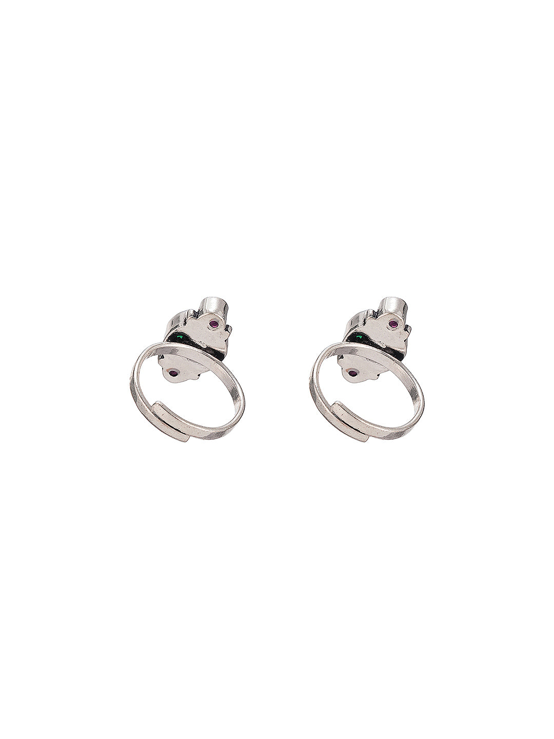 Featuring a striking geometric design, this toe ring is accented with vibrant red and green stones that enhance its traditional appeal. The oxidised silver-plated finish lends a vintage charm, while the handcrafted detailing reflects fine craftsmanship. Designed with an adjustable open fit, it ensures comfortable wear throughout the day.